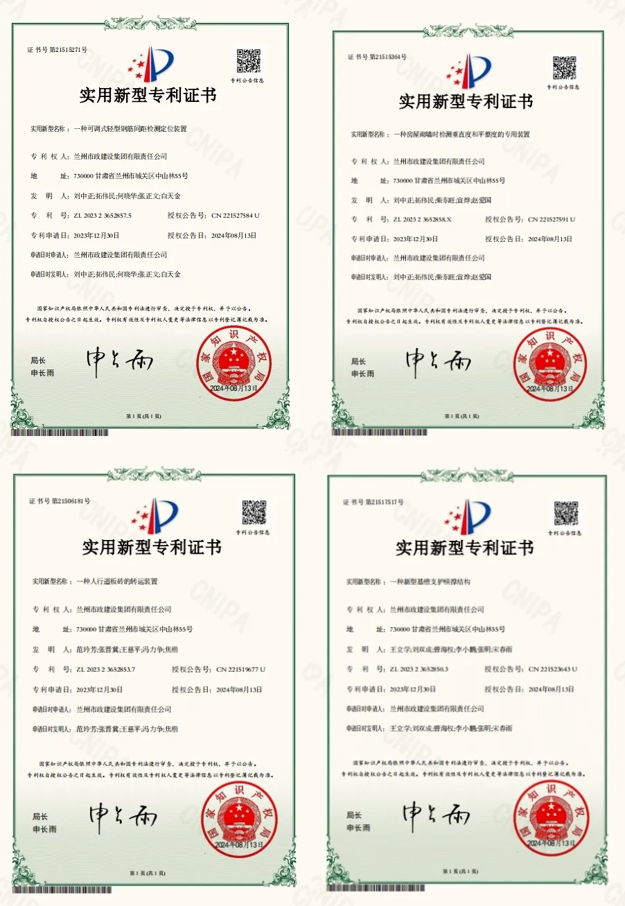 近日,蘭州市政建設(shè)集團(tuán)獲《一種新型基槽支護(hù)橫撐結(jié)構(gòu)》《一種人行道板磚的轉(zhuǎn)運裝置》《一種可調(diào)式輕型鋼筋間距檢測定位裝置》《一種房屋砌墻時檢測垂直度和平整度的專用裝置》4項國家實用新型專利。繼公司5月獲得《一種輔助花崗巖路面鋪裝的移動式多功能裝置》國家實用新型專利授權(quán)后,進(jìn)一步彰顯了公司研發(fā)實力和創(chuàng)新能力的突破。