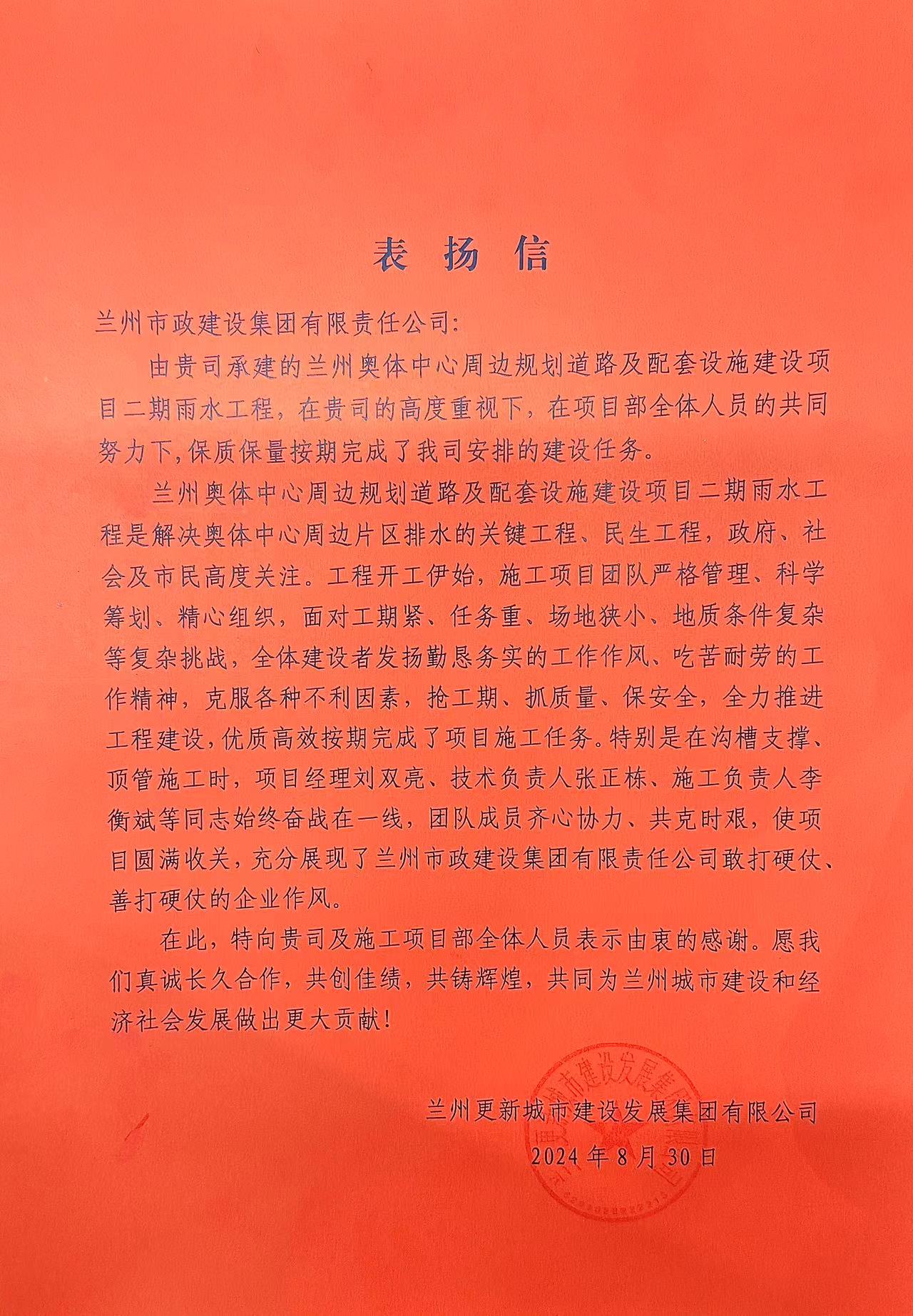 近日,蘭州市政建設(shè)集團(tuán)收到業(yè)主單位蘭州更新城市建設(shè)發(fā)展集團(tuán)有限公司的一封表揚(yáng)信。對(duì)我司承建的蘭州奧體中心周邊規(guī)劃道路及配套設(shè)施建設(shè)項(xiàng)目二期雨水工程,圓滿地完成施工任務(wù),表示衷心的感謝。