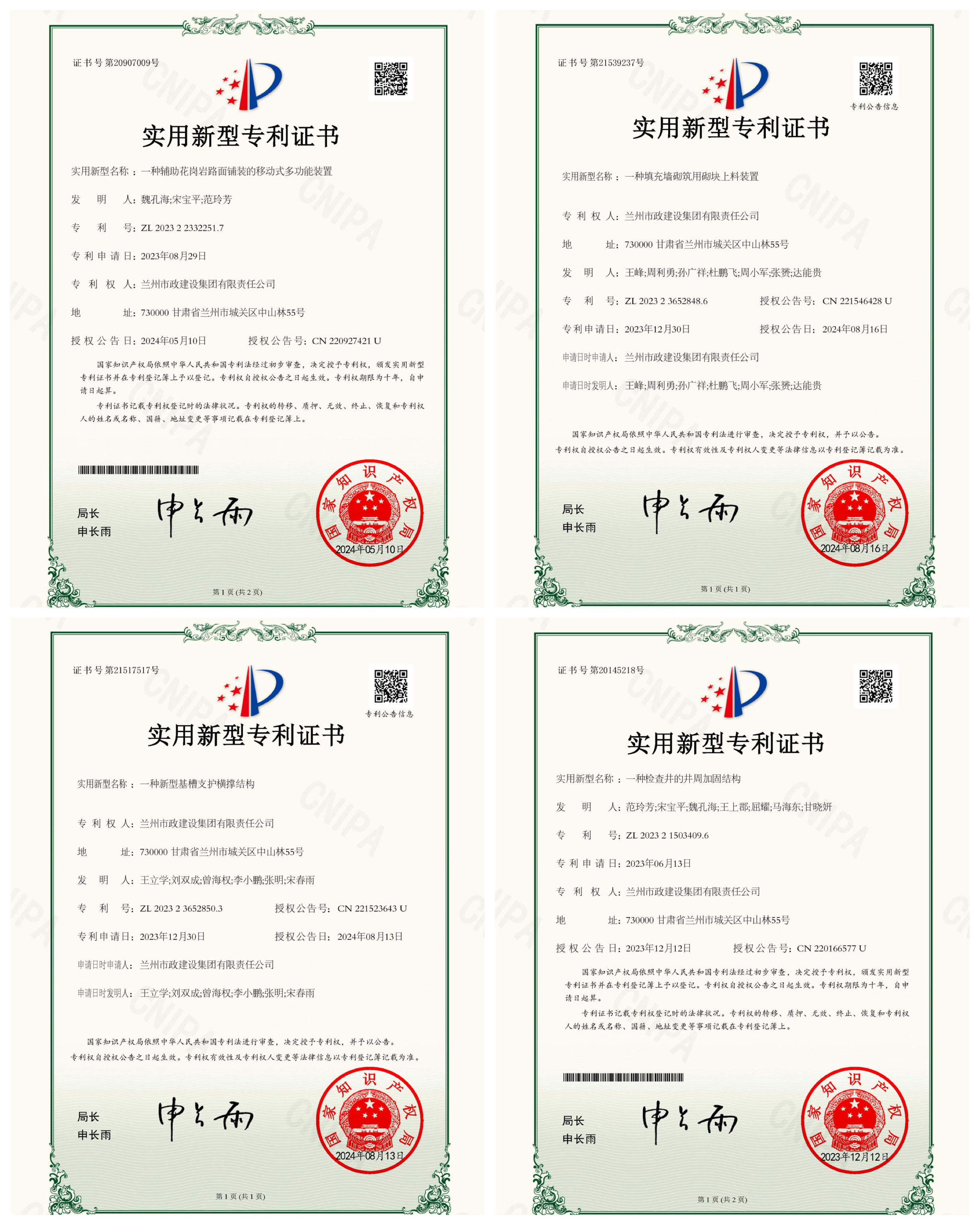 蘭州市政集團(tuán)緊密結(jié)合在建工程施工特點,針對工程施工中的難點及瓶頸問題,持續(xù)加大科技研發(fā)投入,積極開展技術(shù)研發(fā)活動。2024年,公司新增“一種輔助花崗巖路面鋪裝的移動式多功能裝置”“一種填充墻砌筑用砌塊上料裝置”等實用新型專利授權(quán)11項,完成“一種水下灌注樁成孔垂直度檢測裝置”“一種裝配式鋼筋籠定位裝置”等實用新型專利受理10項,完成“一種濕陷性黃土區(qū)域邊坡防護(hù)結(jié)構(gòu)及方法”“路緣石安裝定位裝置及其施工方法”發(fā)明專利受理2項。