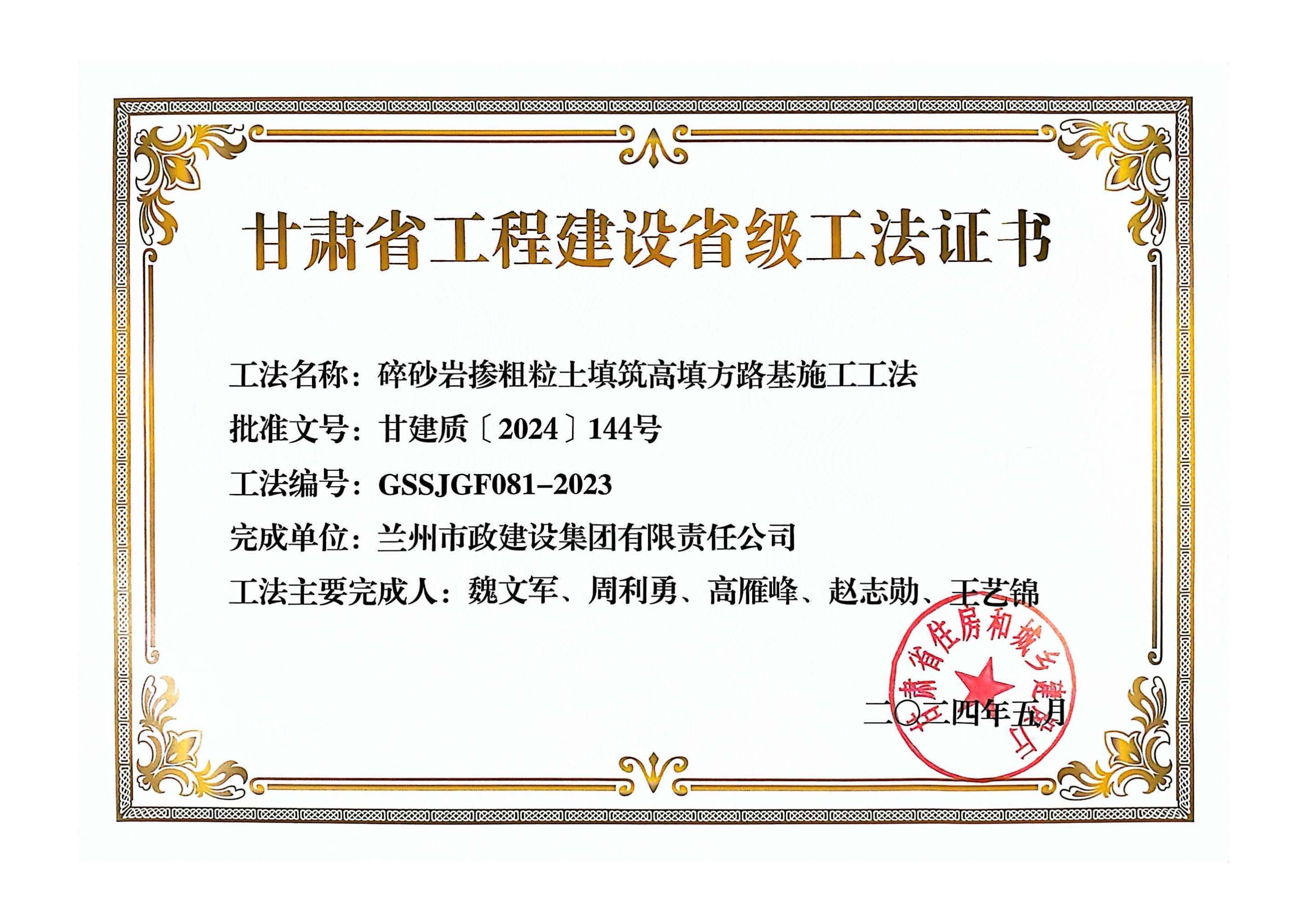 在蘭州經(jīng)濟(jì)技術(shù)開發(fā)區(qū)皋蘭生態(tài)修復(fù)與產(chǎn)業(yè)發(fā)展示范區(qū)(起步區(qū))S1502#路新建工程施工中,道路經(jīng)過帶狀區(qū)域,地形起伏變化較大,大部分段落為深挖、高填區(qū)域,最大填方寬度為180m,高度為46m,針對該工程地質(zhì)條件、地理環(huán)境、工程質(zhì)量要求高、填料特殊等特點,公司結(jié)合實際情況,成立了高填方路基課題技術(shù)研發(fā)小組,通過反復(fù)試驗總結(jié),為消除路基的不均勻沉降,形成了“碎砂巖摻粗粒土在高填方路基中的施工工法”,該工法獲甘肅省工程建設(shè)省級工法。