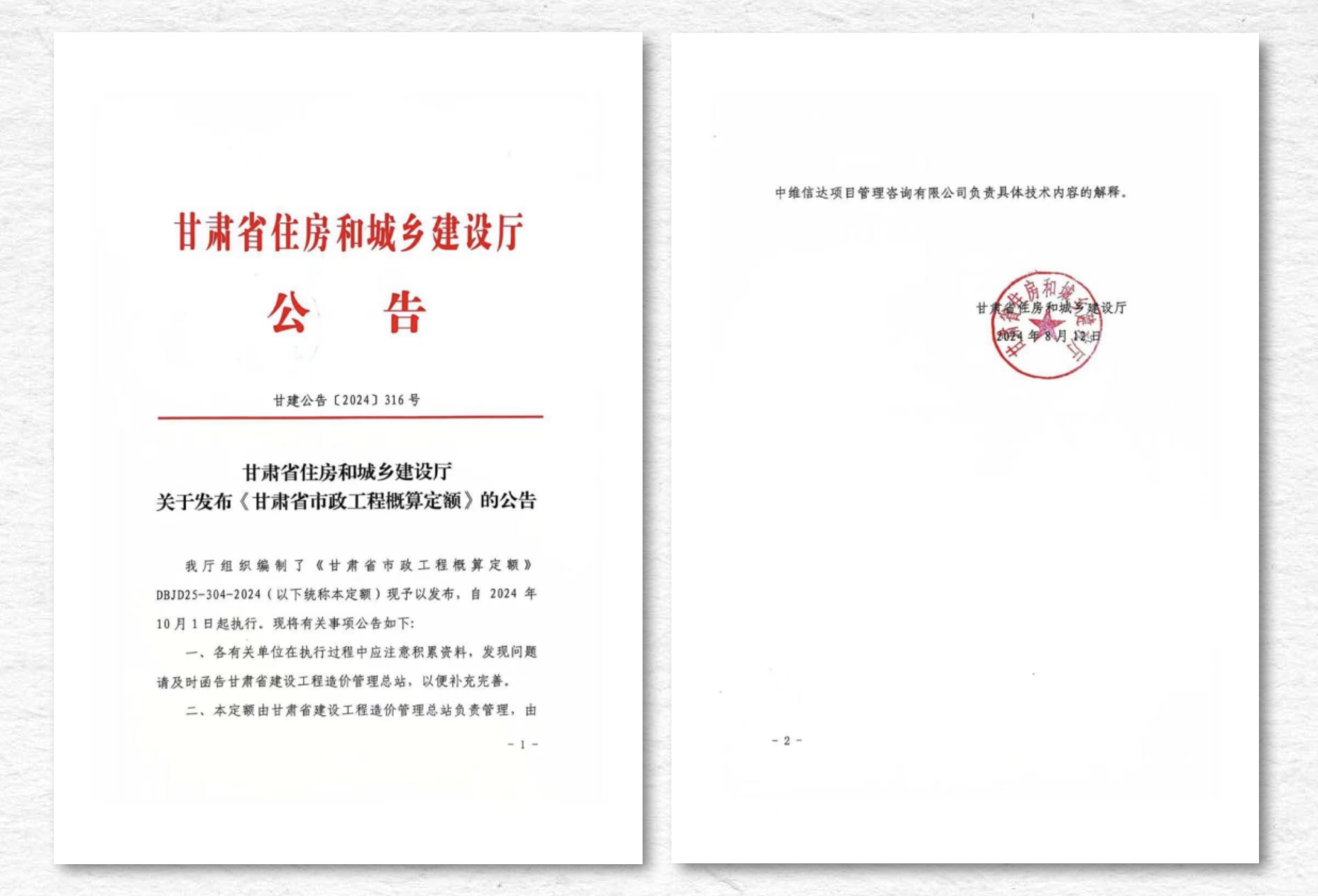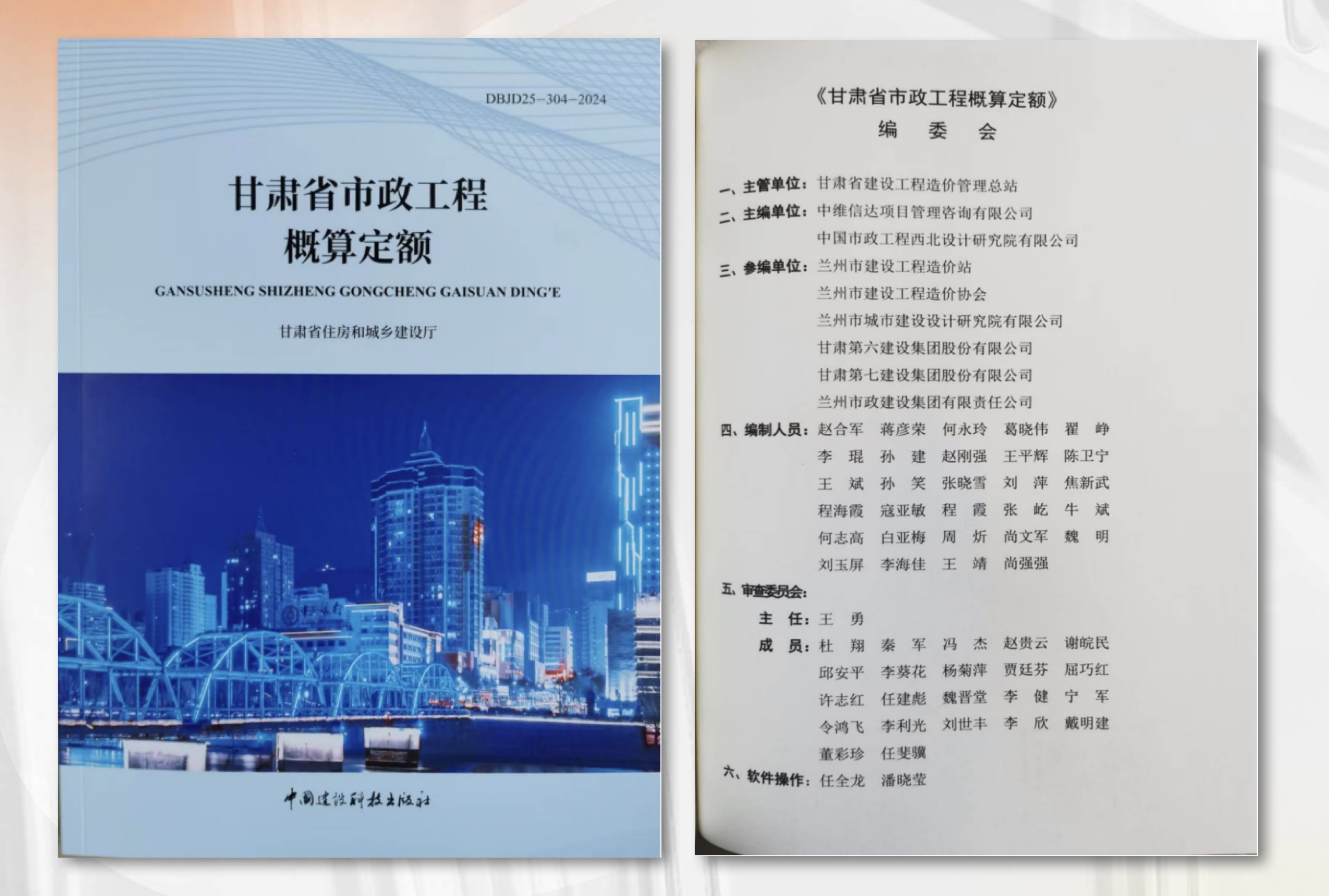 近期,由甘肅省住房和城鄉(xiāng)建設(shè)廳組織、公司參編的《甘肅省市政工程概算定額》順利通過驗收,由甘肅省住房和城鄉(xiāng)建設(shè)廳公告發(fā)布,自2024年10月1日起執(zhí)行。該定額的發(fā)布填補了我省市政概算定額的空白。